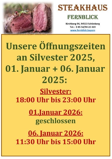 Am 31. Dezember 2025, Silvester, sind wir von 18:00 Uhr bis 23:00 Uhr für Sie da. Gerne können Sie noch reservieren. Am Montag und Dienstag (29.12.und 30.12.) sind wir telefonisch erreichbar.