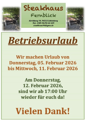 Betriebsurlaub vom 05. Februar 2026 bis 11. Februar 2026. Am Donnerstag, 12. Februar 2026, sind wir ab 17:00 Uhr wieder für Sie da. Betriebsurlaub vom 05. Februar 2026 bis zum 11. Februar 2026. Am Donnerstag, 12. Februar 2026, sind wir ab 17:00 Uhr wieder für Sie da. Betriebsurlaub vom 05. Februar 2026 bis zum 11. Februar 2026. Am Donnerstag, 12. Februar 2026, sind wir ab 17:00 Uhr wieder für Sie da.